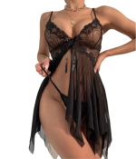 Baby doll en encaje y malla de dos piezas. Incluye baby doll y panty.